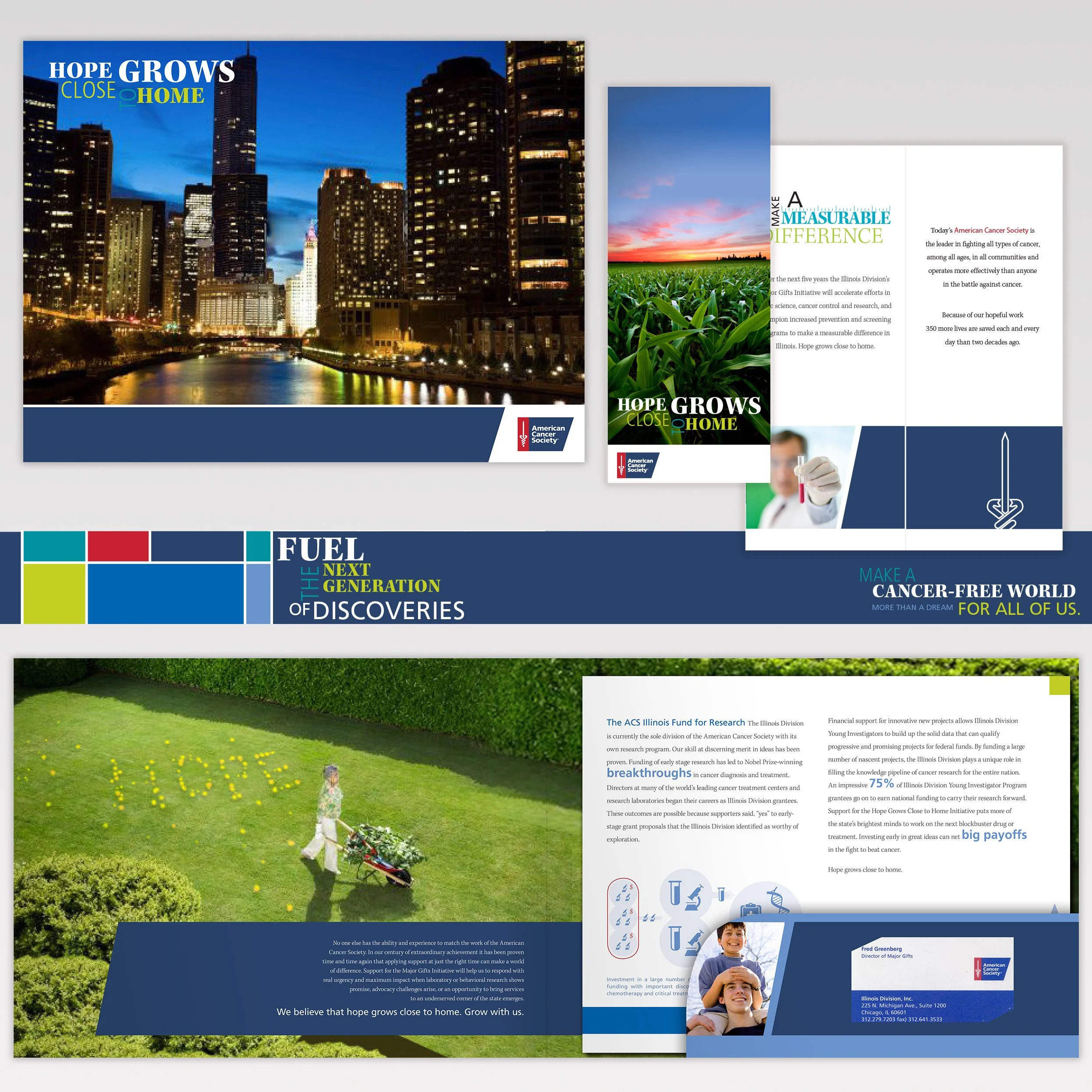 Concept: Most donors were high-earning, high-education midwesterners who had been touched by cancer themselves. The tag, “Hope Grows Close to Home” was developed to combat the feeling of hopelessness a potential donor feels when faced with a cancer diagnosis. A variety of Illinois home-types are used with the verbiage “hope” lighting them, or blooming around them, allowing city, suburb, and rural families to see themselves in the imagery. Inserts for each folder could be swapped out to match individual concerns, budgets, or expected results.