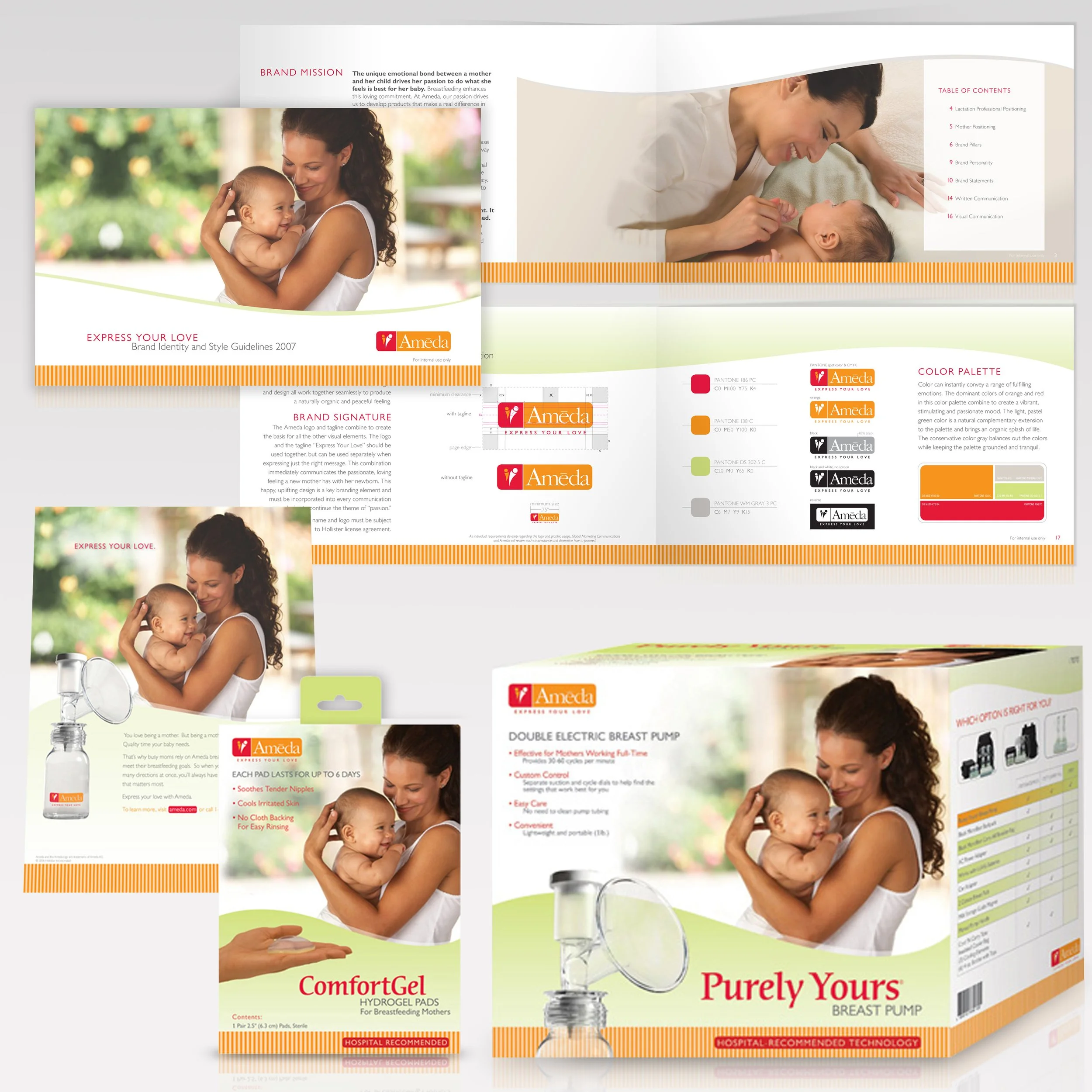 Concept: As the inventor of the modern breast pump and hospital standard, Ameda needed to enter the B2C market looking scientifically-focused rather than cute. The wave points to the adjustable cycle (of which Ameda is the inventor of). Imagery is feminine and nurturing without being sweet.
