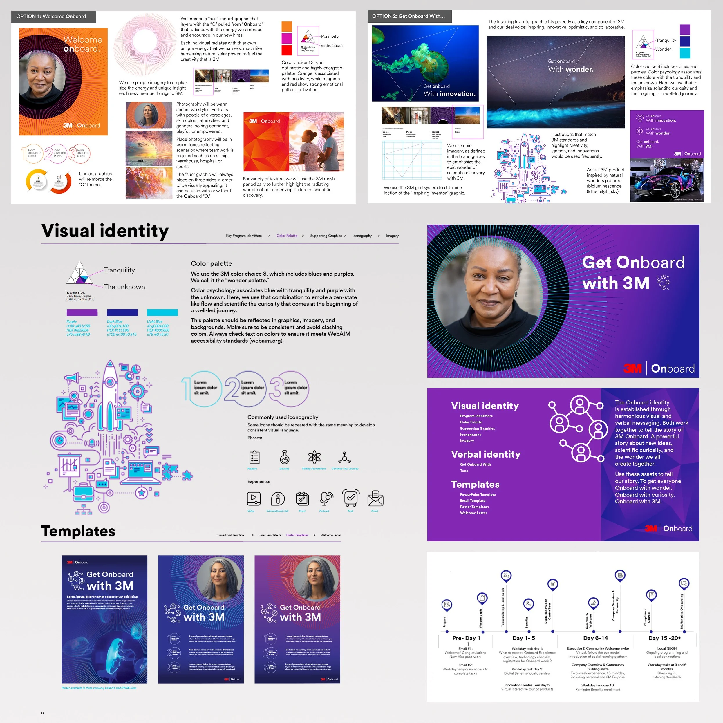 Concept: Our verbal and visual identity work together to tell a powerful story about new ideas, scientific curiosity, and the wonder created together. To get everyone Onboard with wonder. Onboard with curiosity. Onboard with 3M. A sun line-art graphic layers with the “O” pulled from “Onboard” that radiates with the energy we embrace and encourage in our new hires. The sun graphic paired with diverse portraiture allows individuals to see themselves as the radiant energy that fuels the company. Onboarding materials included a journey map outlining the basic onboarding process for a grounding experience.